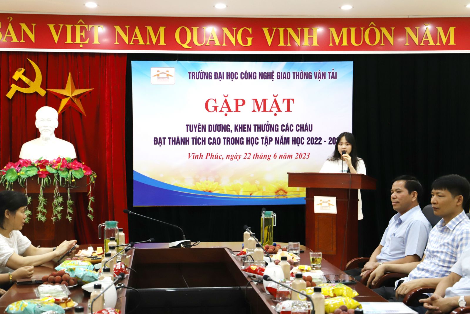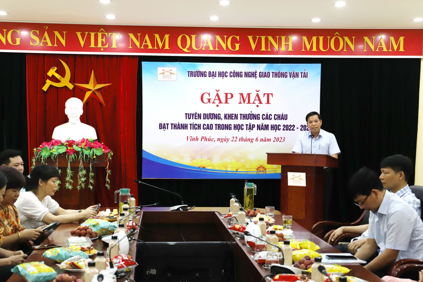 Thay mặt lãnh đạo Nhà trường, đ/c Vương Văn Sơn - Giám đốc trung tâm QPAN-GDTC trường ĐHCNGTVT bày tỏ niềm vui mừng đối với kết quả học tập, rèn luyện của các cháu thanh thiếu nhi là con của CB, VC, NLĐ Cơ sở đào tạo Vĩnh Phúc trong năm học 2022-2023 vừa qua đã đạt nhiều thành tích đáng khích lệ, giành nhiều giải cao cấp quốc gia, cấp tỉnh, cấp thành phố góp phần làm tăng thêm truyền thống học tập tốt đẹp của con em các cán bộ nhà trường. Đồng thời, đ/c Vương Văn Sơn chúc các cháu tiếp tục phát huy những thành tích đã đạt được, cố gắng nỗ lực hơn nữa để giành nhiều thành tích cao hơn nữa trong thời gian tới, luôn là niềm tự hào của gia đình để bố mẹ yên tâm công tác.