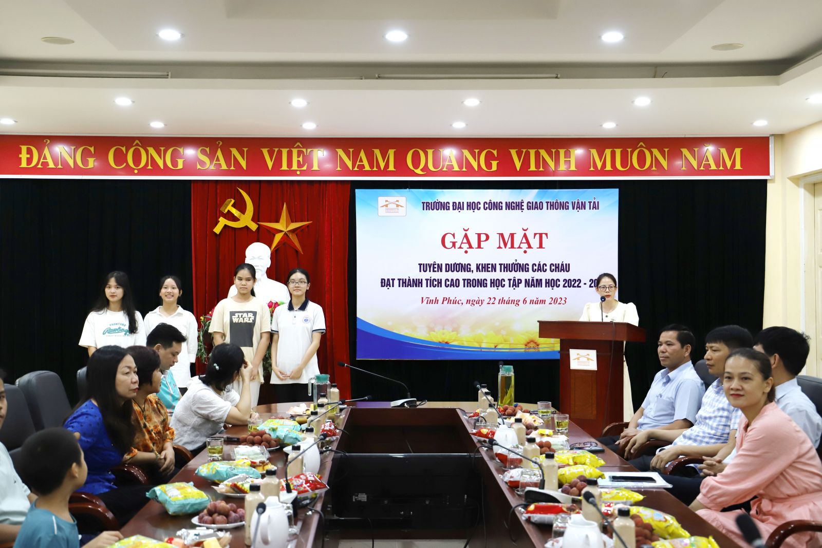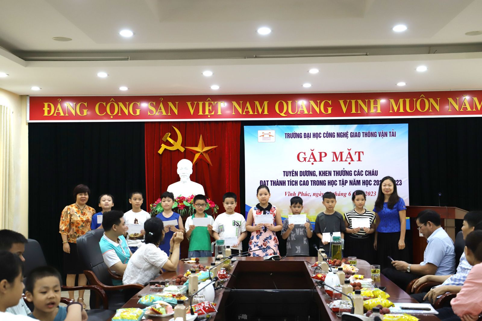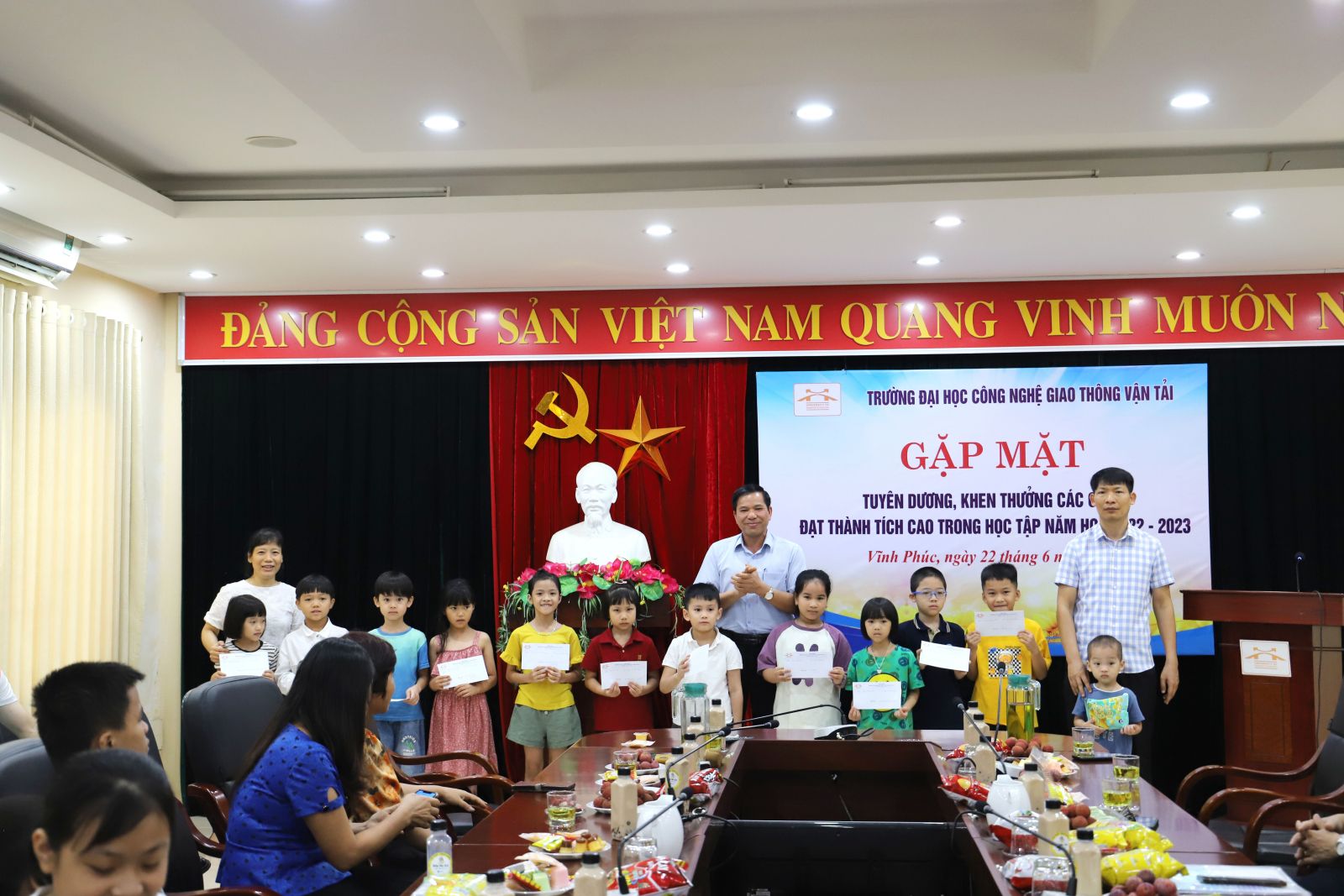 Thực hiện Chương trình hoạt động công đoàn năm học 2022-2023, được sự nhất trí của Đảng ủy, Ban Giám hiệu nhà trường. Sáng nay, ngày 23/06/2022, Công đoàn cơ sở đào tạo Vĩnh Phúc phối hợp với ban nữ công đã tổ chức Chương trình gặp mặt tuyên dương, khen thưởng các cháu là con cán bộ, viên chức, người lao động Nhà trường đã đạt thành tích cao trong học tập năm học 2022-2023.