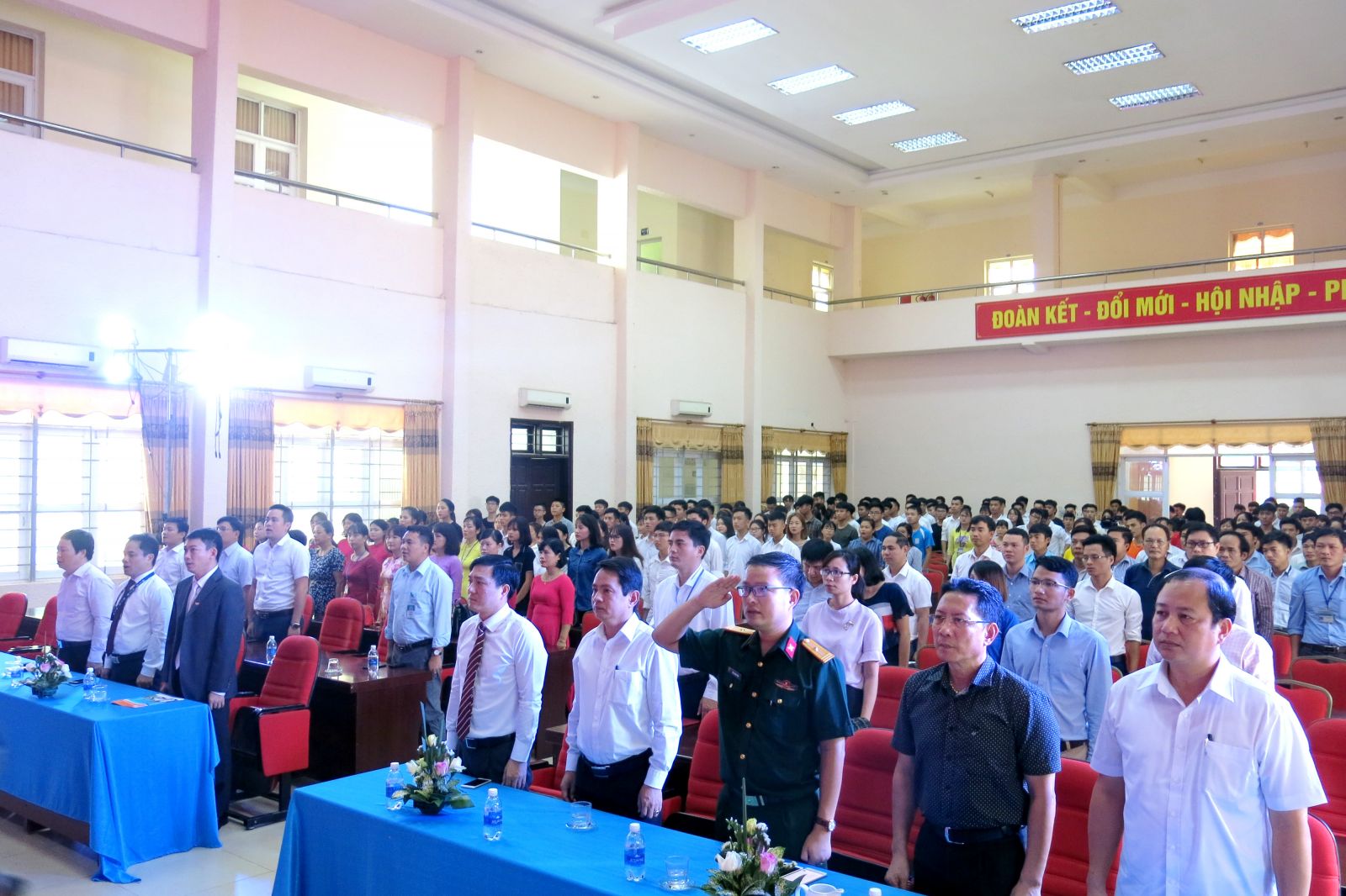 Các đại biểu, khách mời cùng toàn thể lãnh đạo, cán bộ, giảng viên, sinh viên Nhà trường thực hiện nghi thức chào cờ và hát Quốc ca tại Lễ khai giảng năm học 2018 – 2019