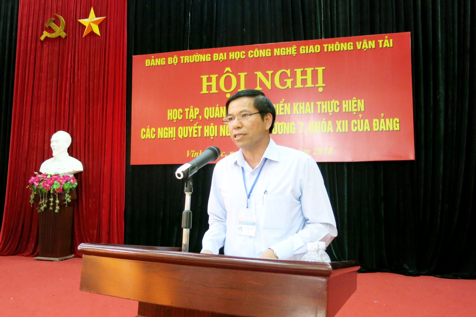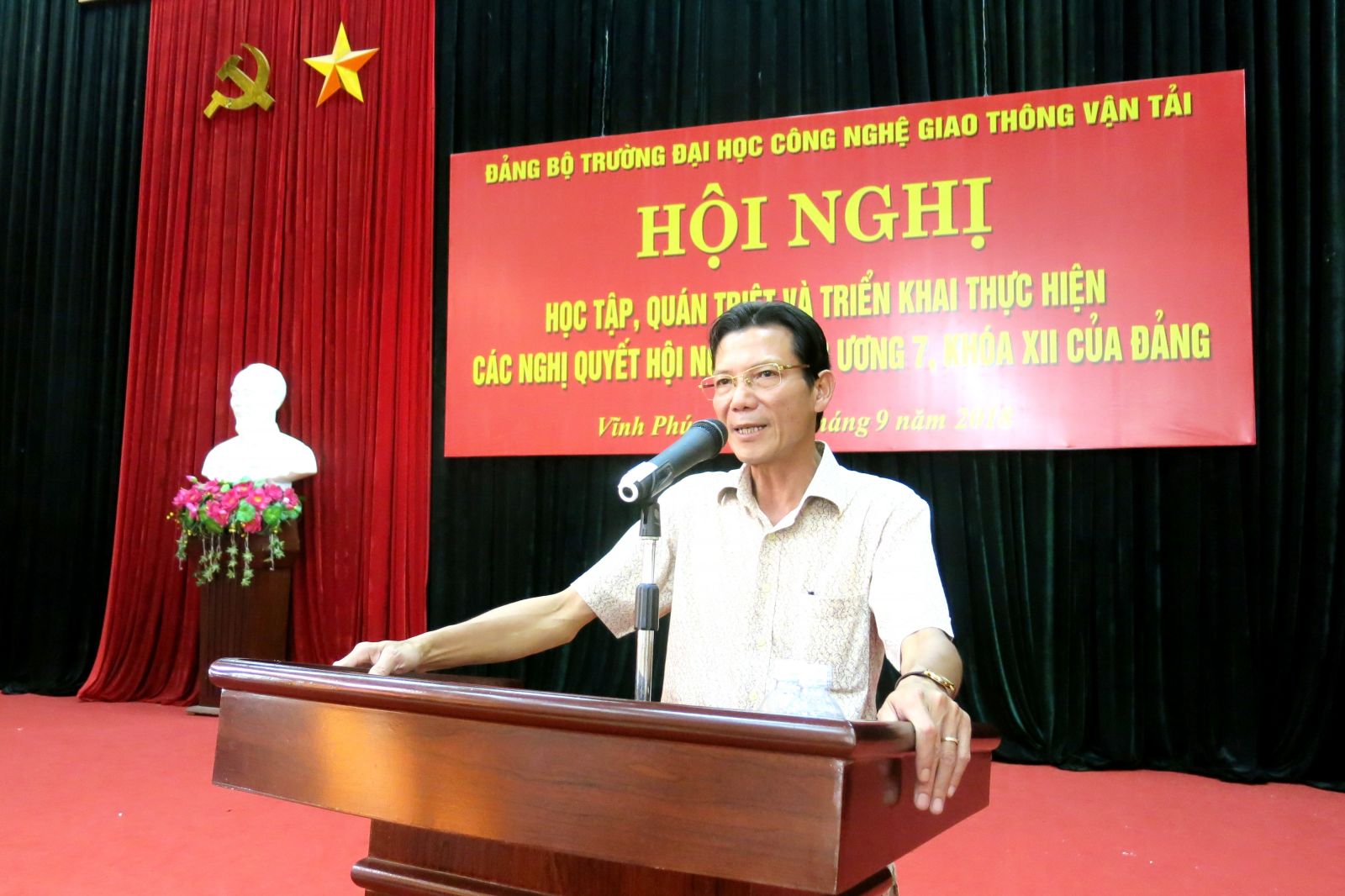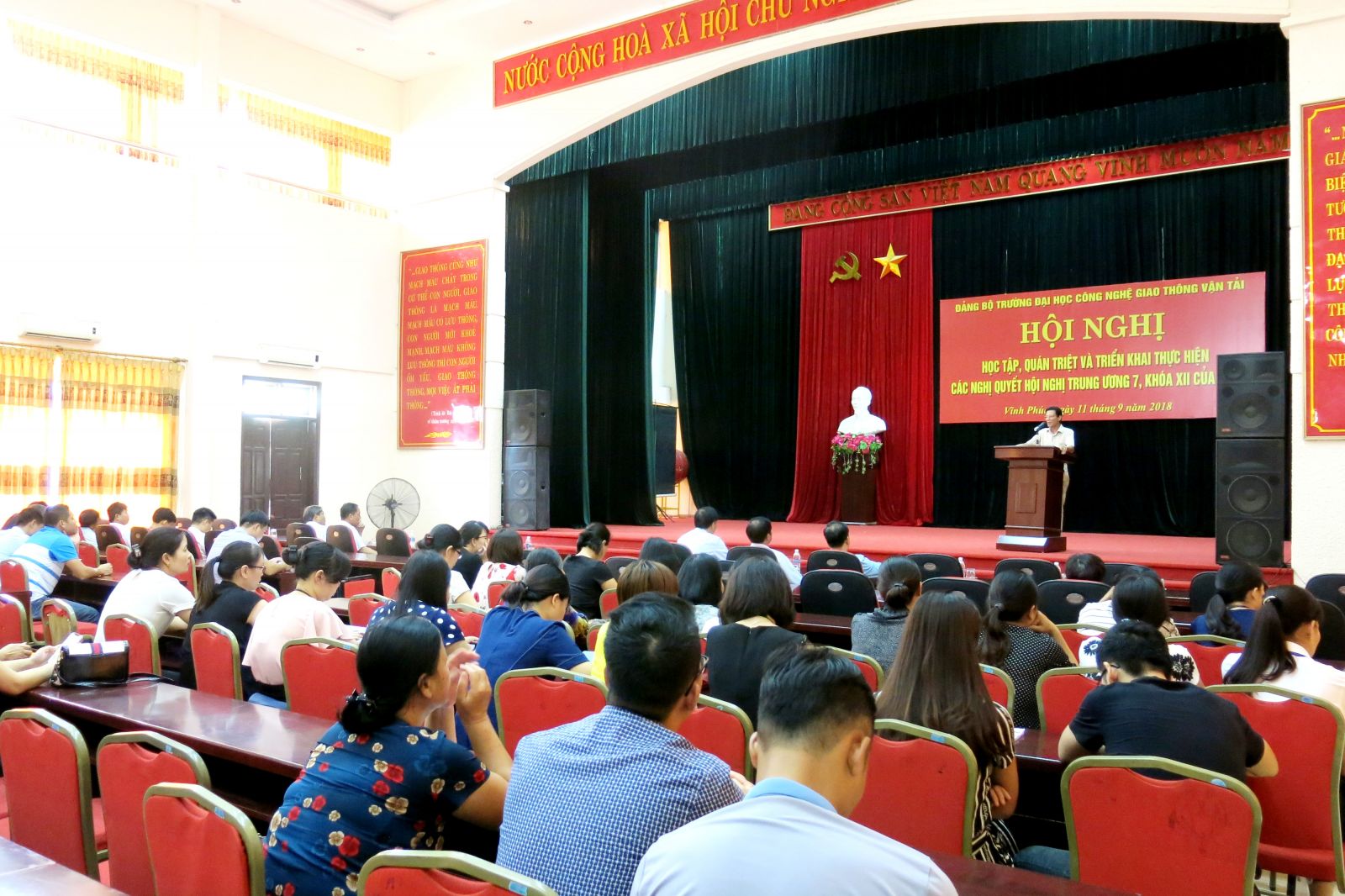 Chiều ngày 11/9/2018, tại Hội trường lớn Cơ sở đào tạo Vĩnh Phúc, Đảng bộ Trường Đại học Công nghệ Giao thông vận tải tổ chức “Hội nghị học tập, quán triệt, triển khai thực hiện các nghị quyết Hội nghị Trung ương 7, khóa XII của Đảng” cho toàn thể các Đảng viên, lãnh đạo các Phòng, Ban, Khoa, Trung tâm, cán bộ, giảng viên, CNV Nhà trường.