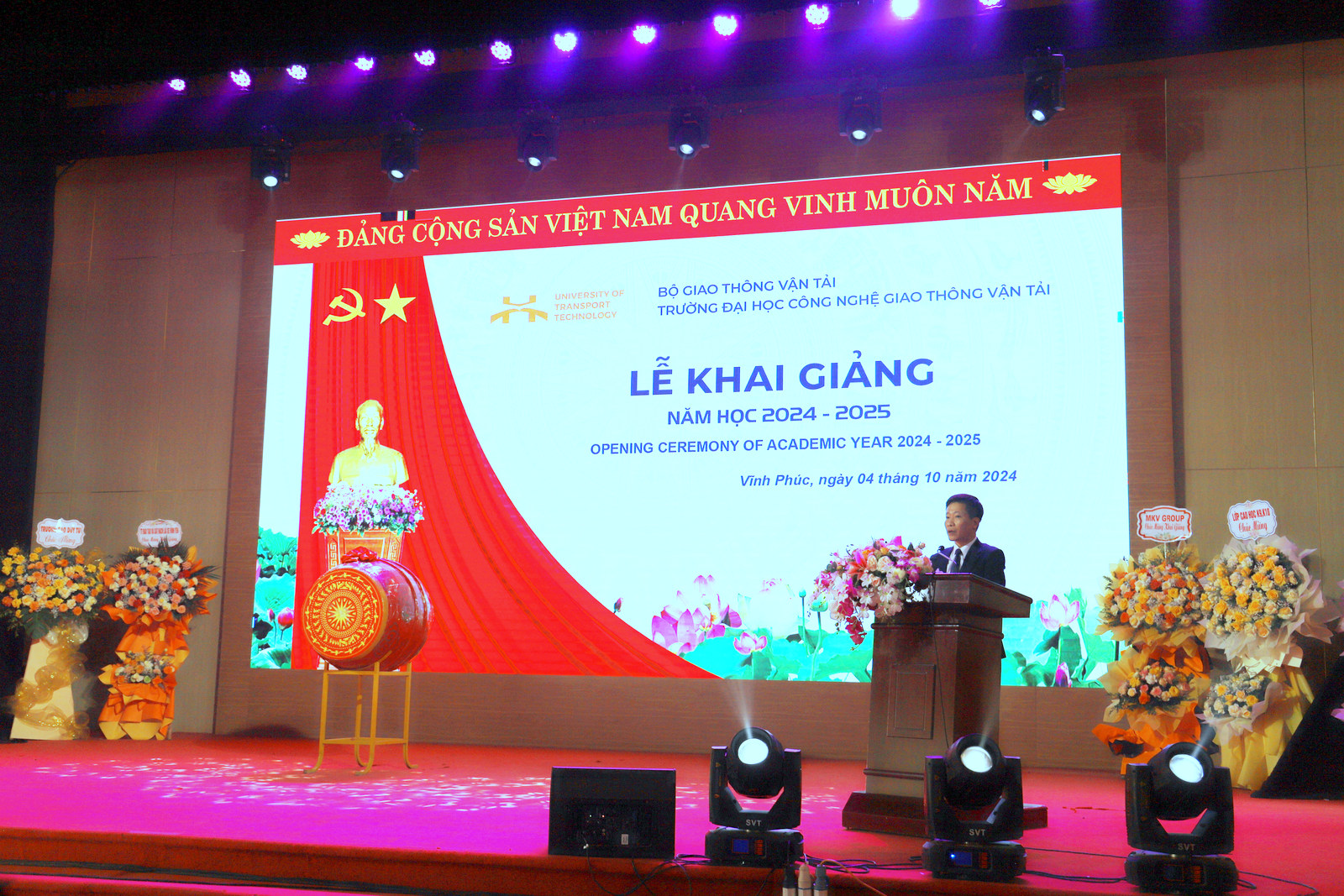 Phát biểu tại Lễ khai giảng, PGS.TS Nguyễn Hoàng Long gửi lời chúc mừng đến các tân sinh viên đã vượt qua hành trình học tập vất vả, một kì thi tốt nghiệp đầy cạnh tranh để chính thức trở thành thành viên của Trường Đại học Công nghệ GTVT. “Các em có quyền tự hào về những nỗ lực của bản thân, tự hào là sinh viên của ngôi trường có bề dày truyền thống lịch sử và đào tạo chất lượng cao với nhiều hoạt động sinh viên sôi nổi. Các em hãy đặt ra cho mình những mục tiêu ngay từ bây giờ để xứng đáng với công lao nuôi dưỡng, dạy dỗ, yêu thương của ông bà, cha mẹ, gia đình và thầy cô”.